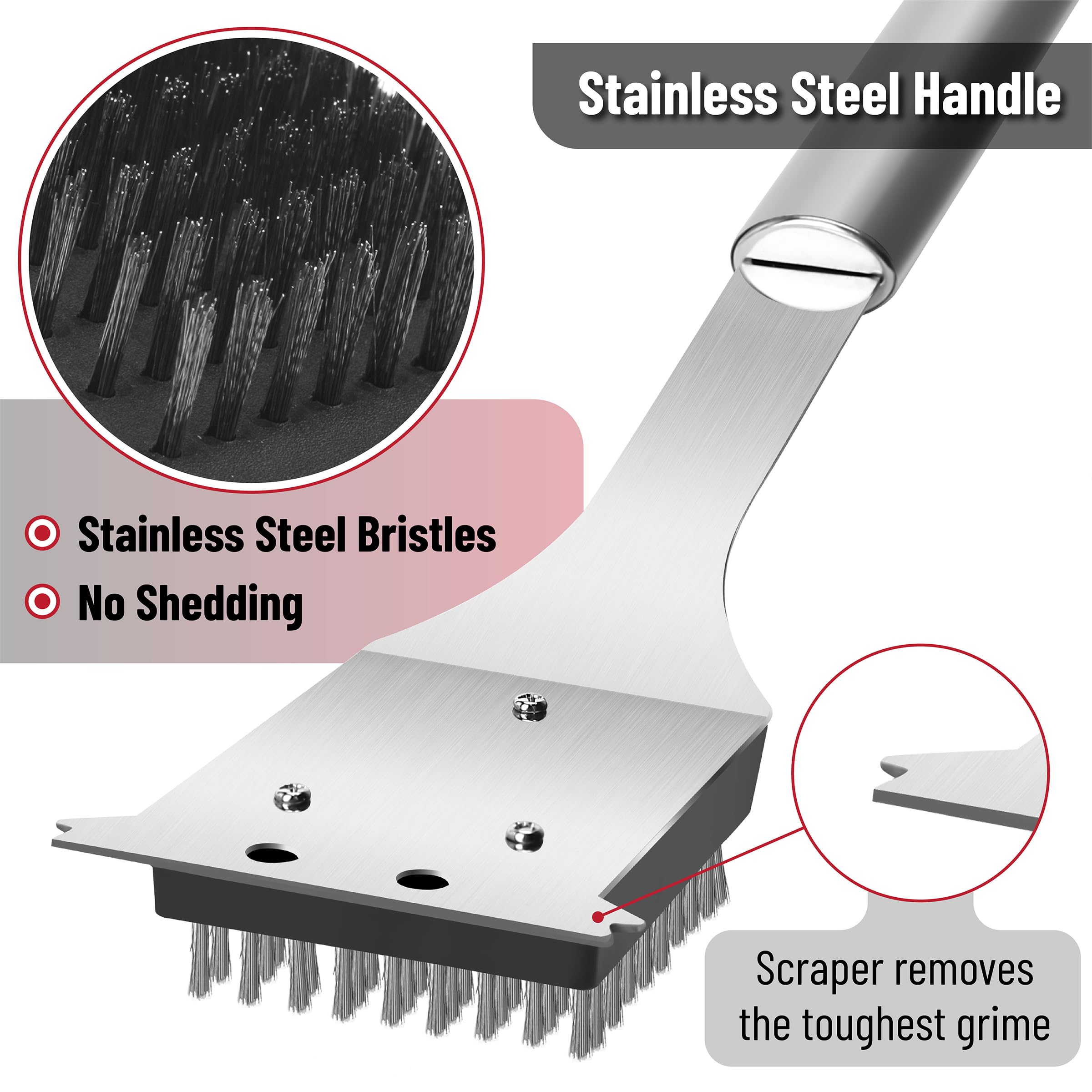- Ergonomic Handle: Measuring 16.7 inches, the long handle provides sufficient leverage and dstance from the hot grill, ensuring safe and comfortable cleaning without the risk of burns.