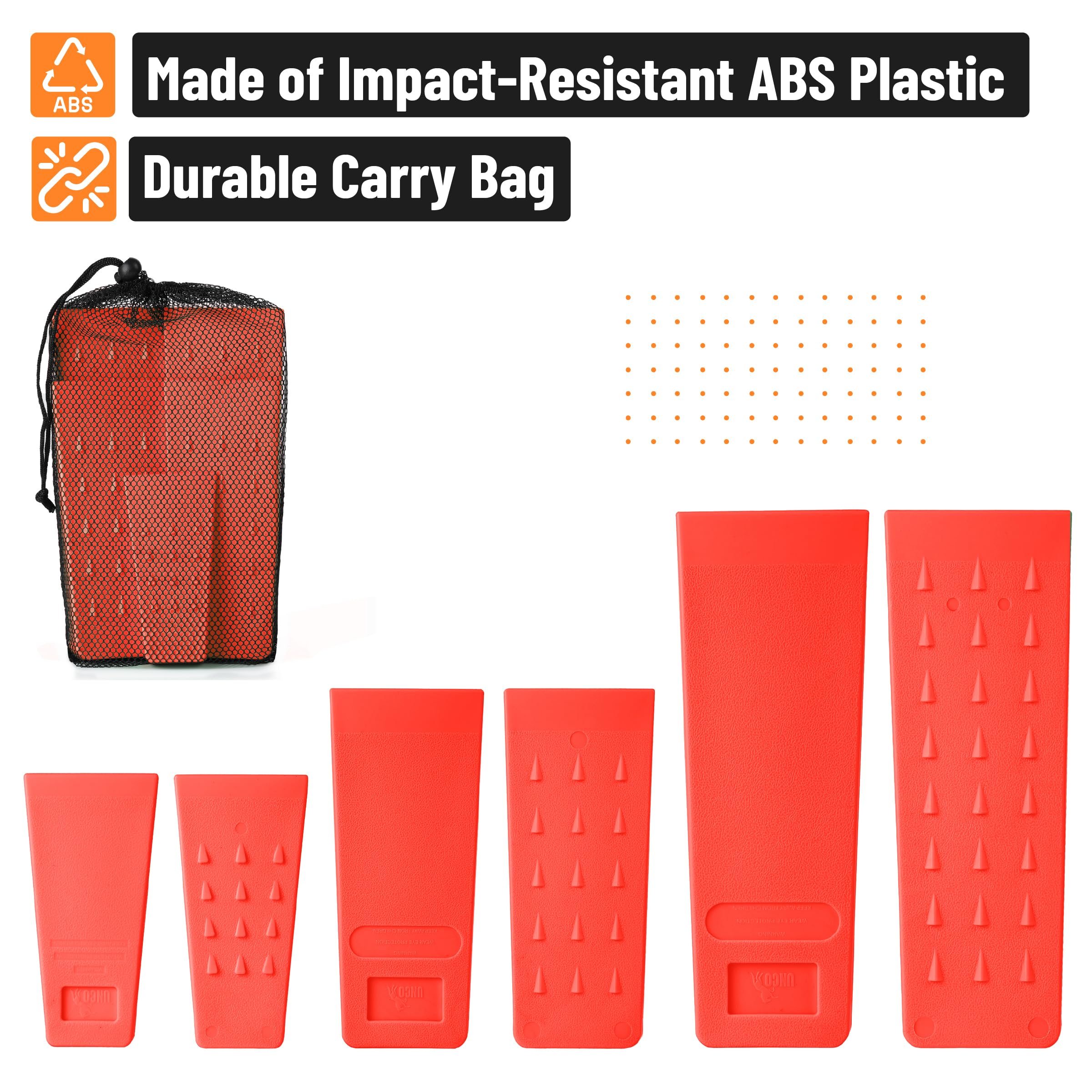 UNCO- Tree Felling Wedges with Spikes, 6 pcs, 5.5", 8" & 10", Orange Wedges with Storage Bag, Splitting Wedge, Plastic Wedges for Tree Cutting, Logging Tools and Equipment, Chainsaw Wedges for Trees